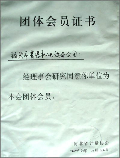計量協(xié)會團體會員證書