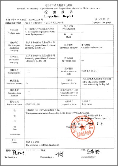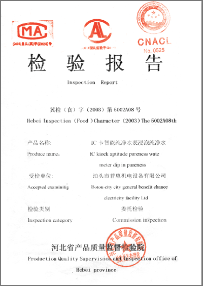 | 檢驗報告 “IC卡智能純凈水水表浸泡純凈水”